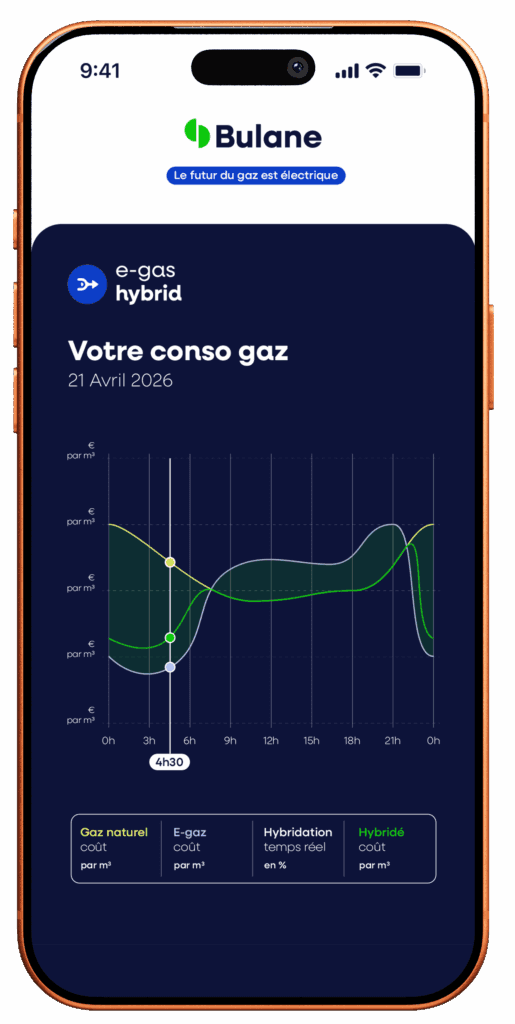 Bulane vous présente e-gas pilot, sa technologie de gestion de mix énergétique qui suit en temps réel vos options : gaz fossile ou gaz électrique (hydrogène).